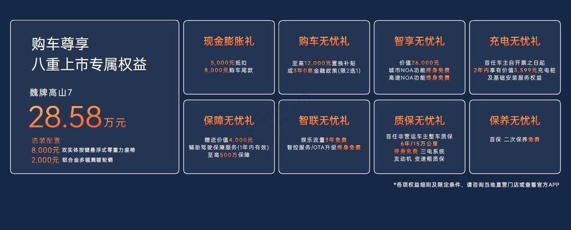 为让用户轻松畅享豪华家庭出行,高山7不仅拥有诚意满满的价格,更准备了包含“5000元抵扣8000元购车尾款”、“至高12000元置换补贴或3年0息金融政策”、“价值26000元的城市及高速NOA功能终身免费”等丰厚的八重上市专属权益。